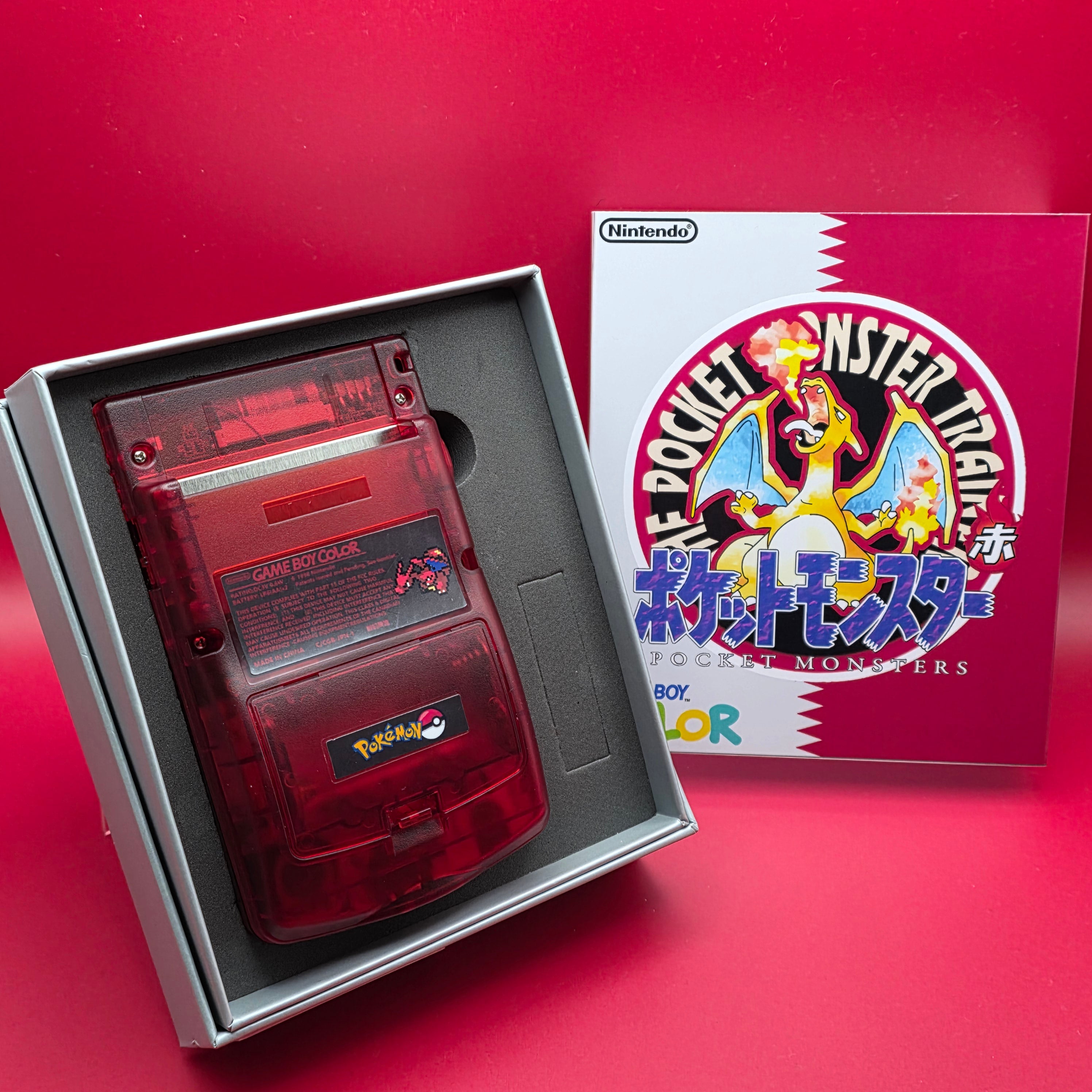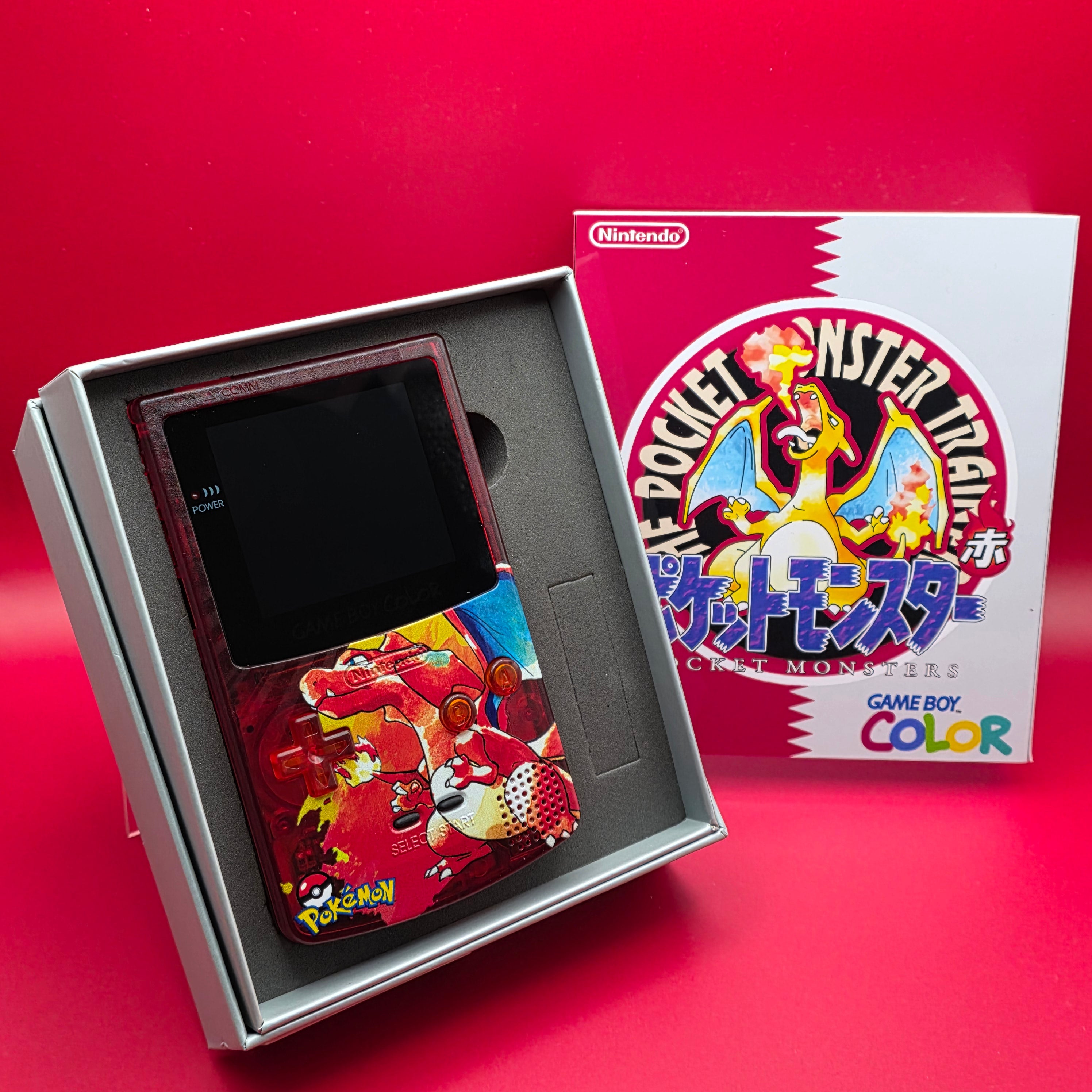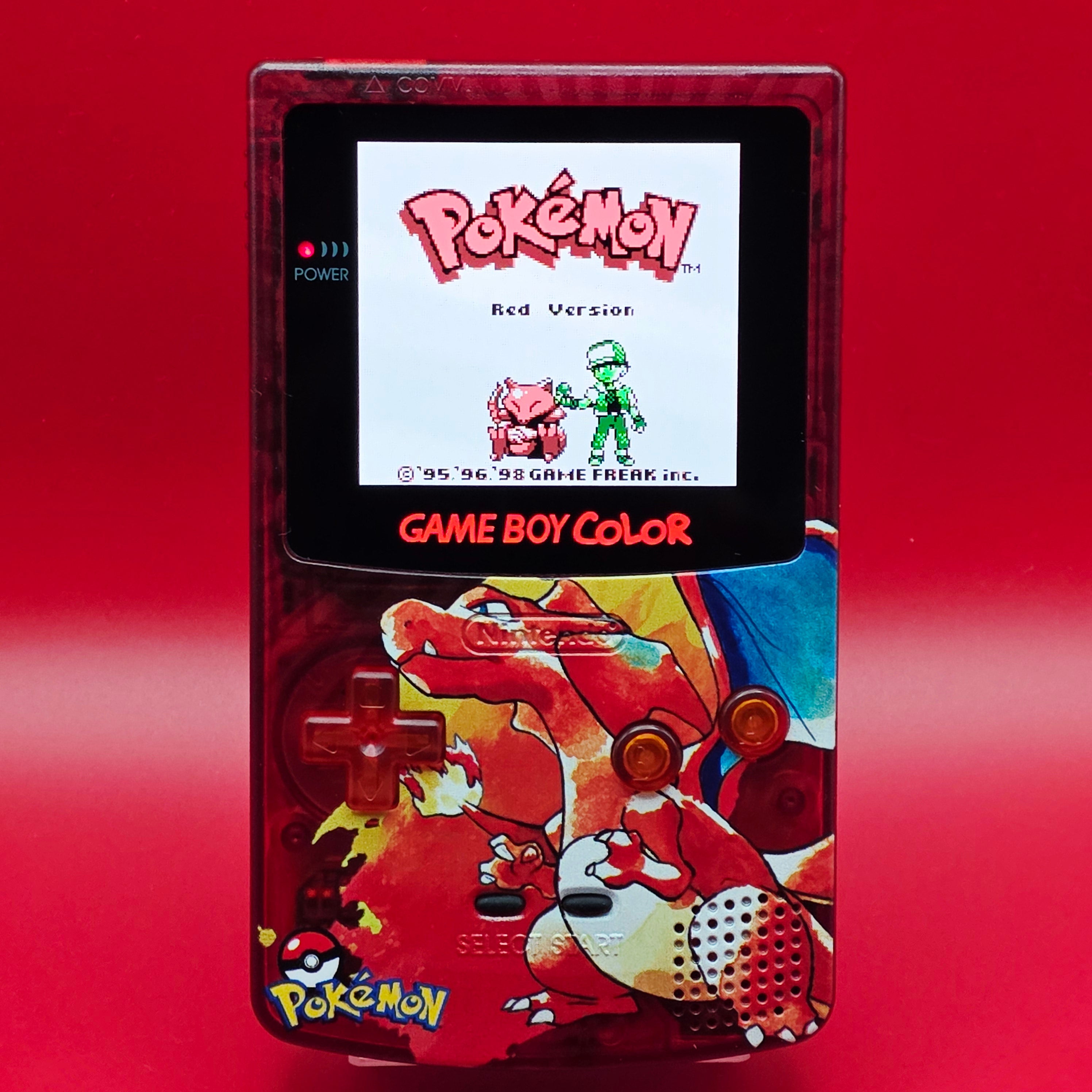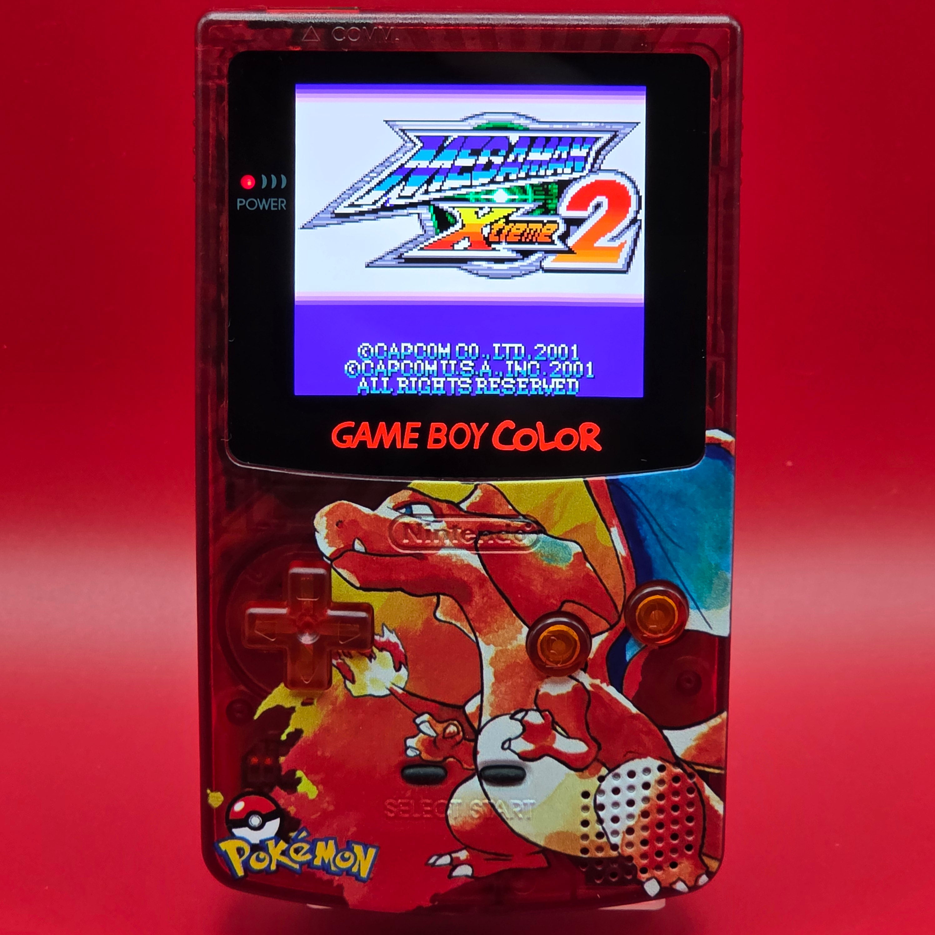 Here we have a Modded Game Boy Color with an AMOLED screen featuring a custom UV printed Charizard Shell.